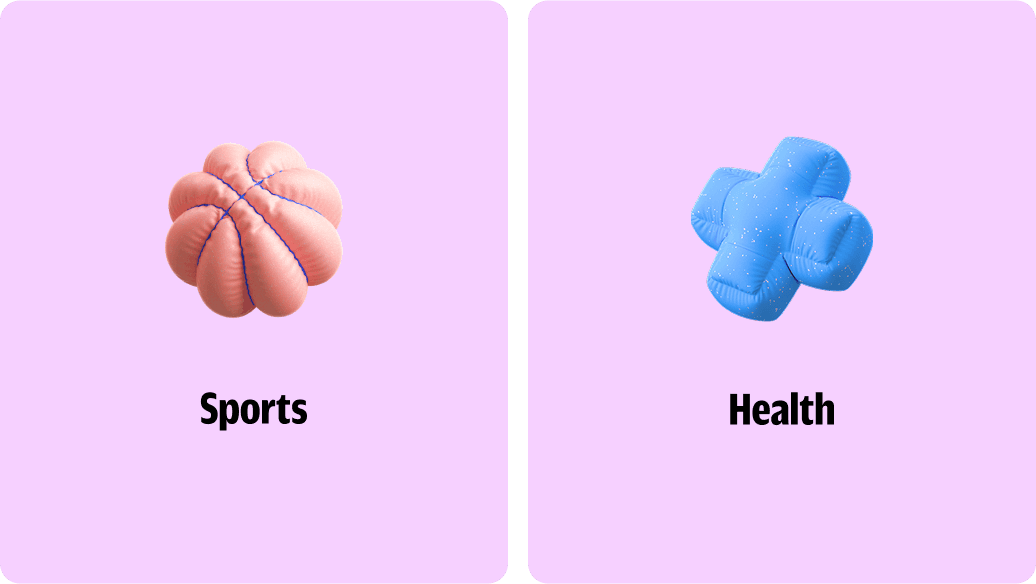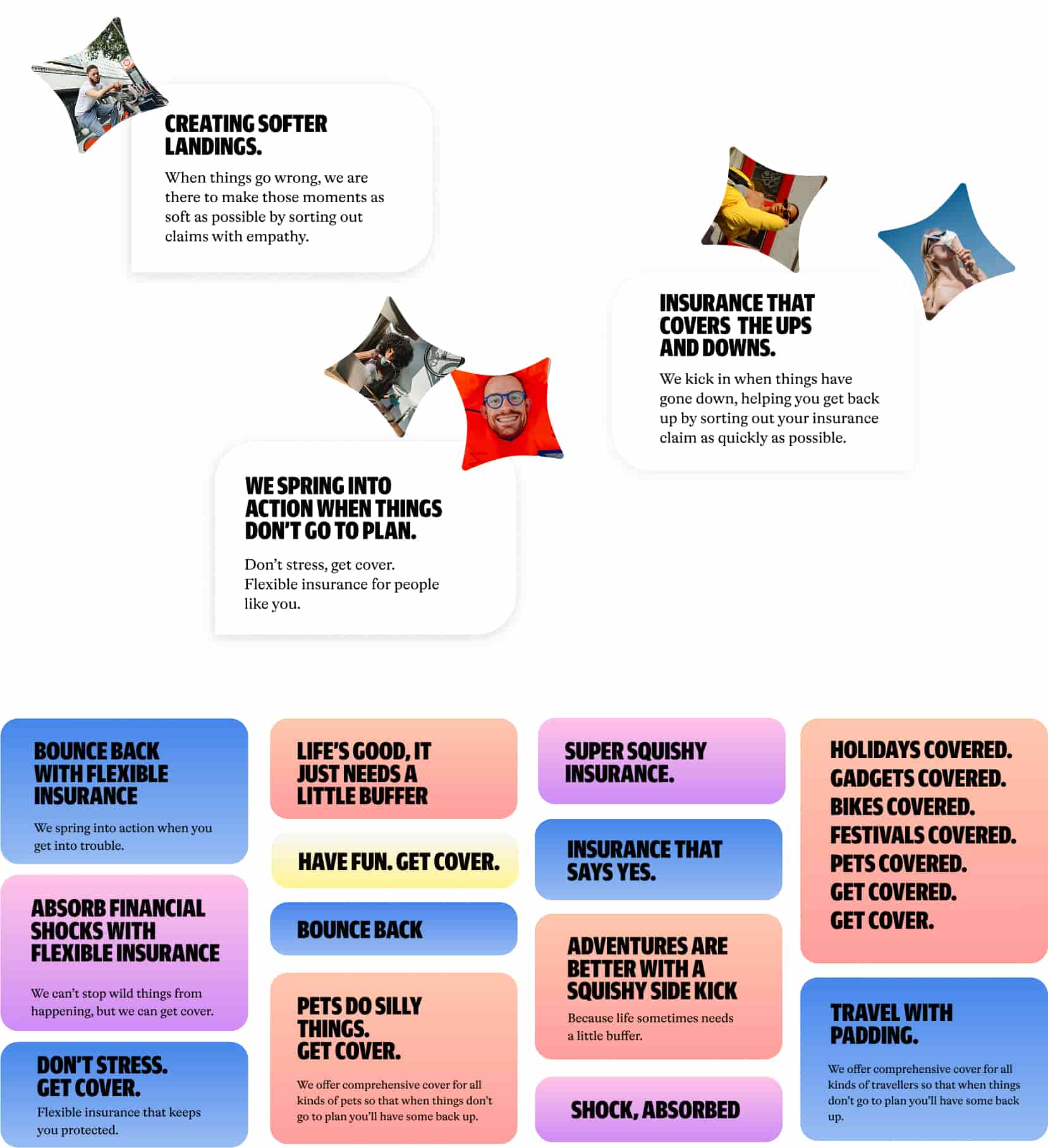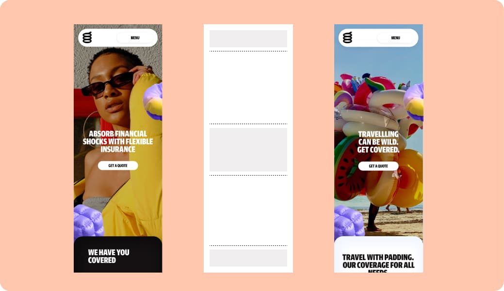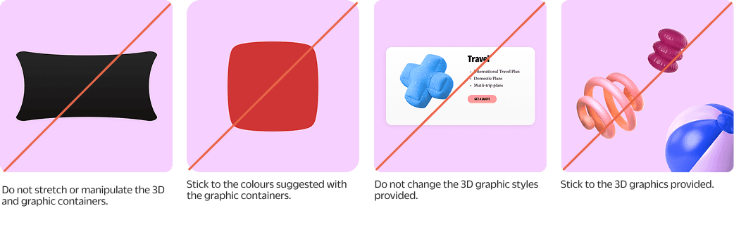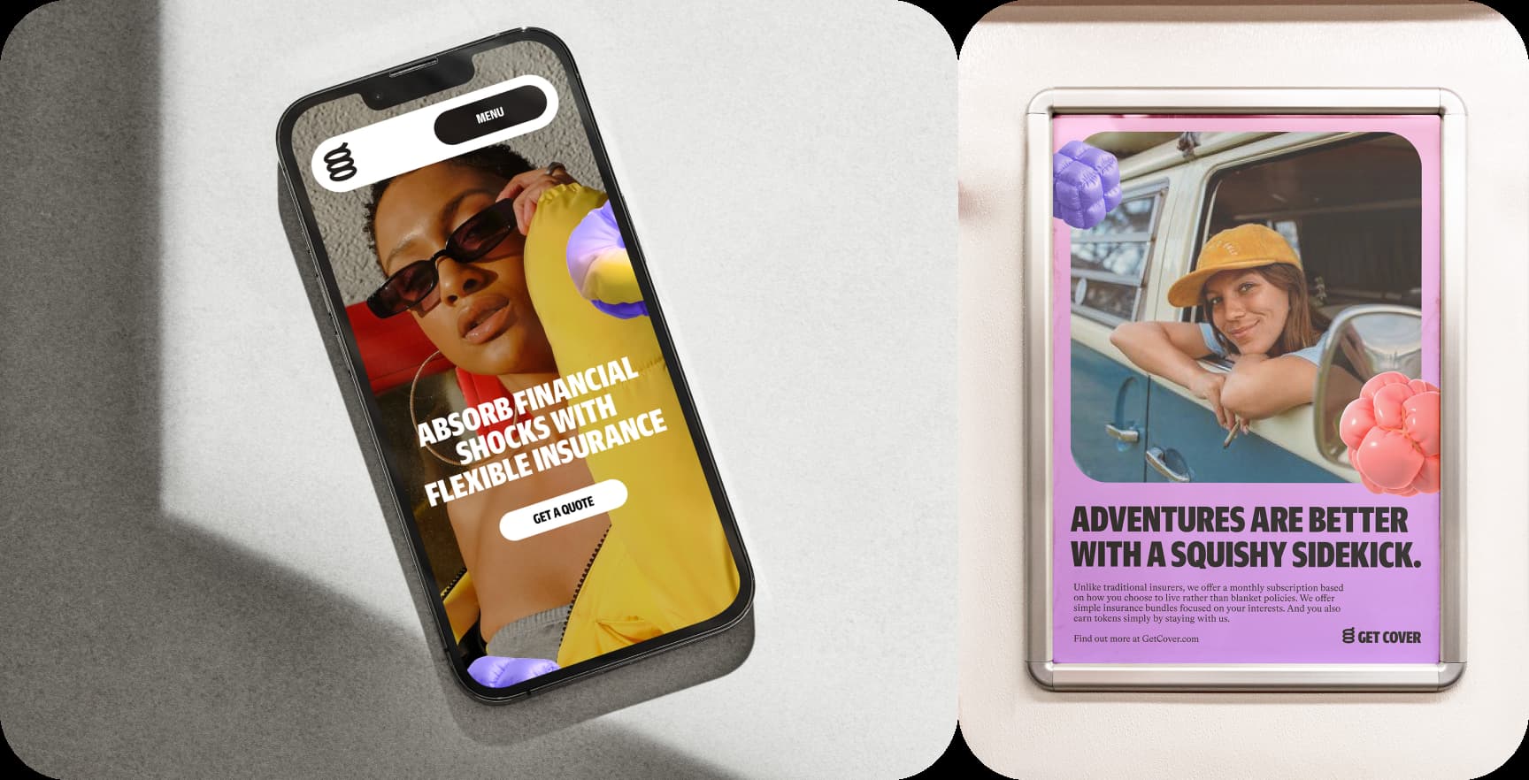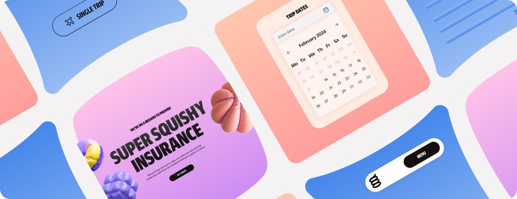 These squishy shapes, used with a sense of playfulness, help visually represent key product categories—for example, a dog bone for pet insurance or a beach ball for travel-related coverage.