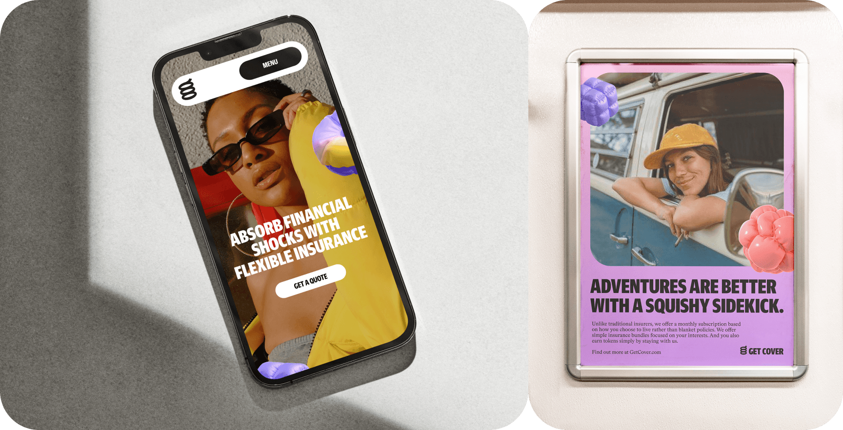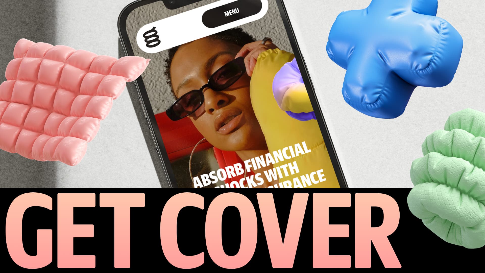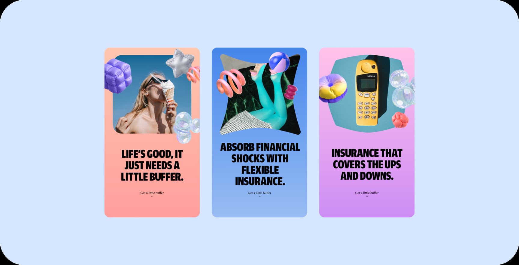 The 3D shapes function as visual shock absorbers. They reflect softness, bounce, and security—reinforcing the idea that the brand is here to help when things go wrong.