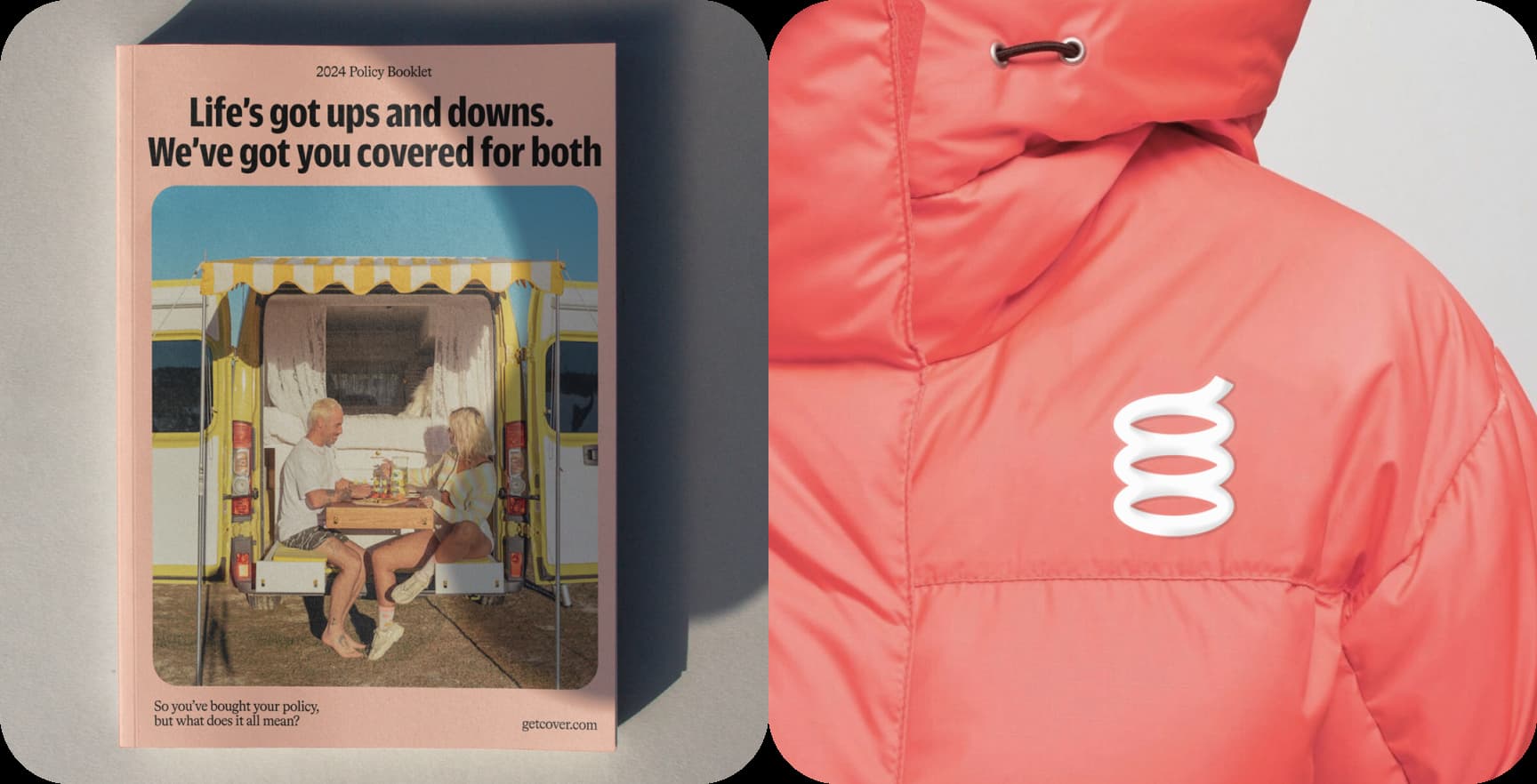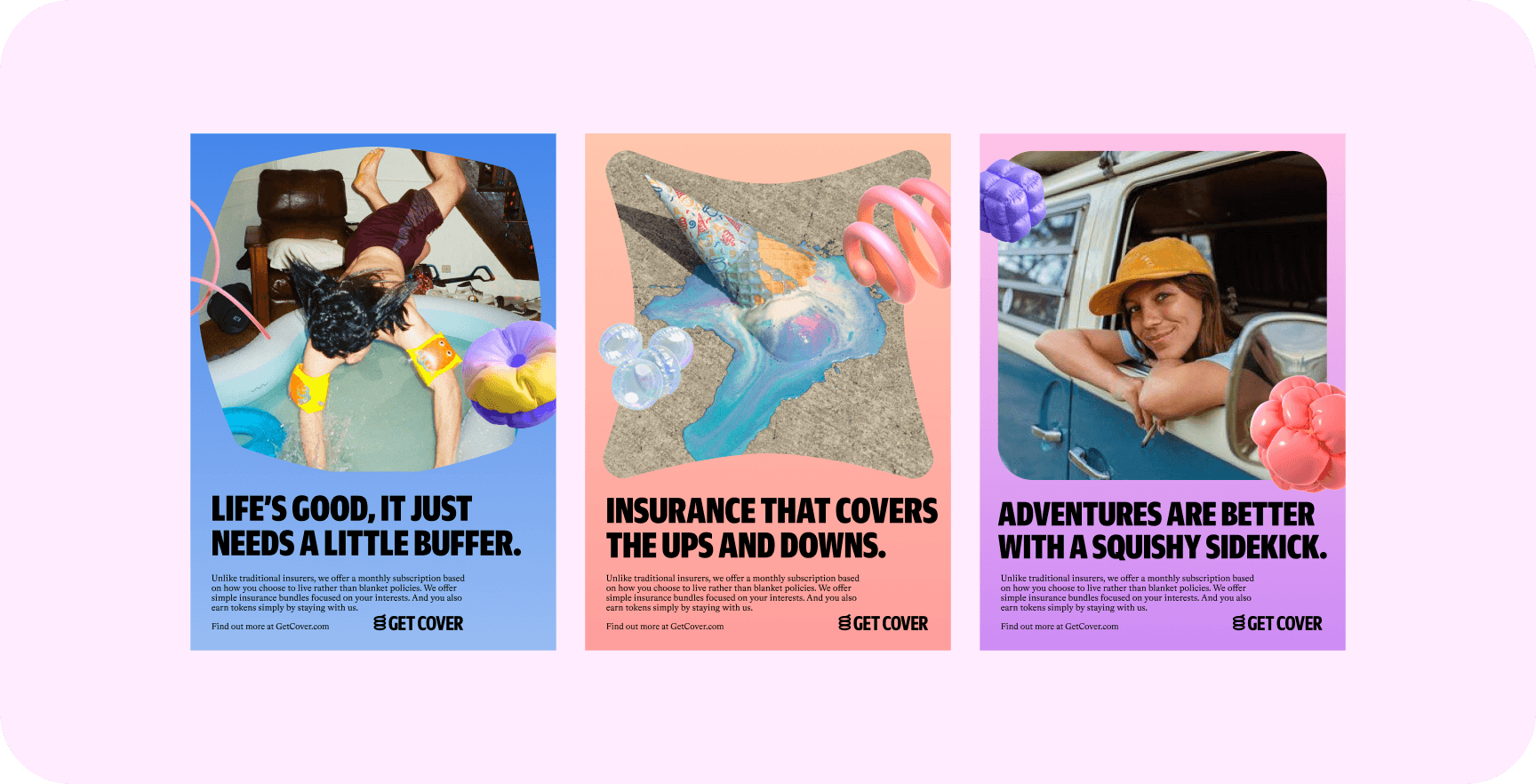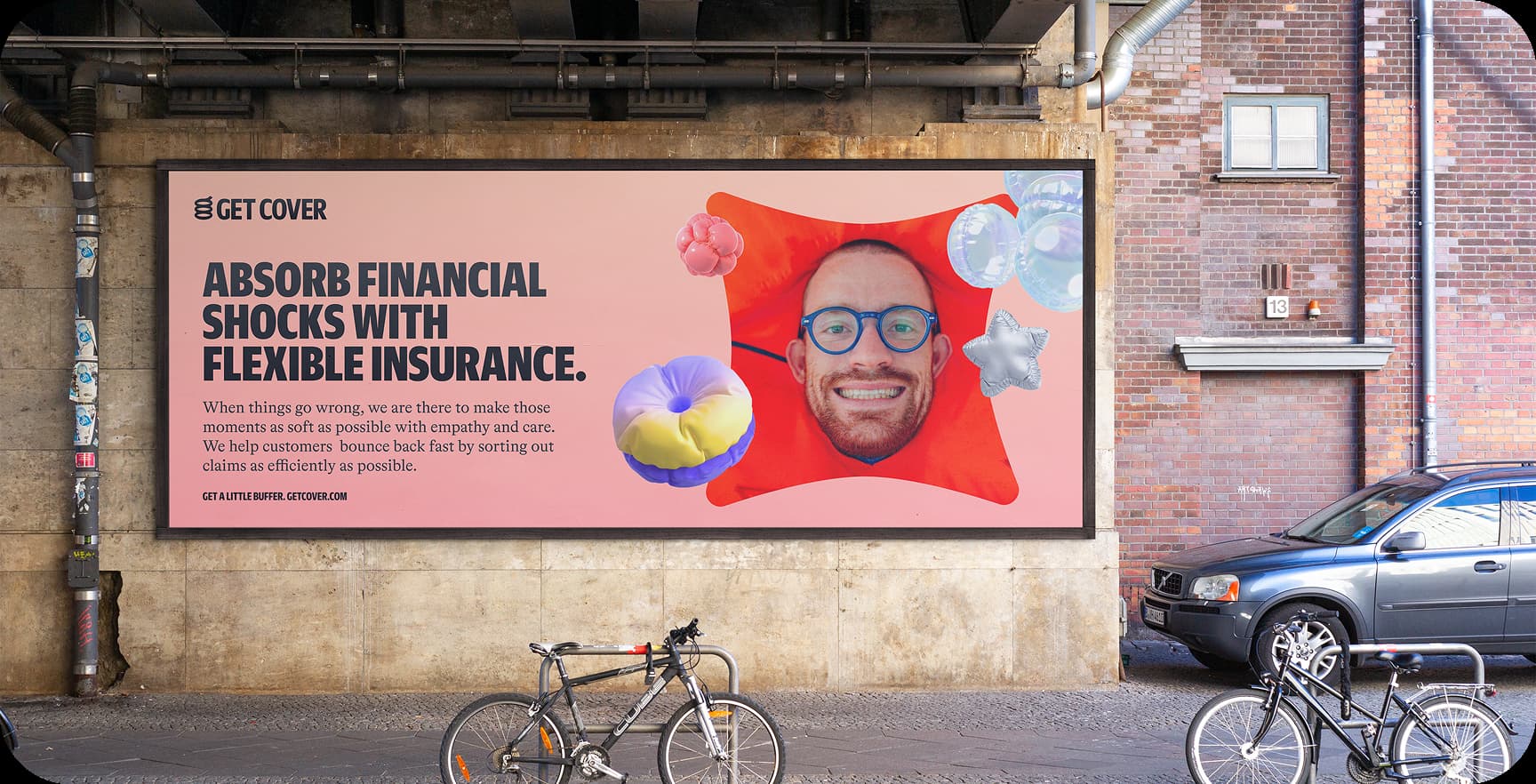 The 3D shapes function as visual shock absorbers. They reflect softness, bounce, and security—reinforcing the idea that the brand is here to help when things go wrong.