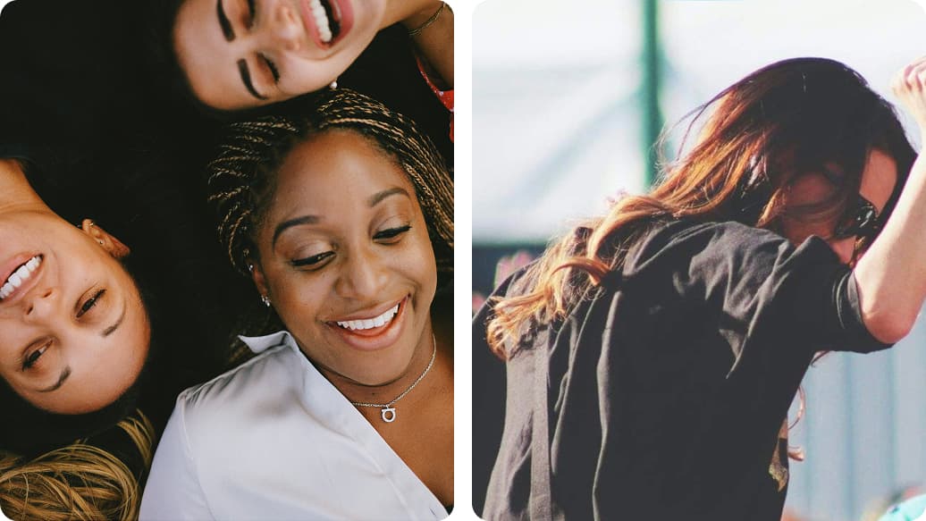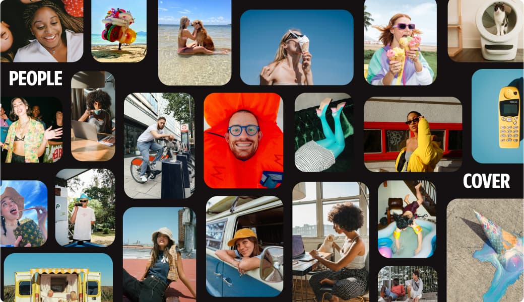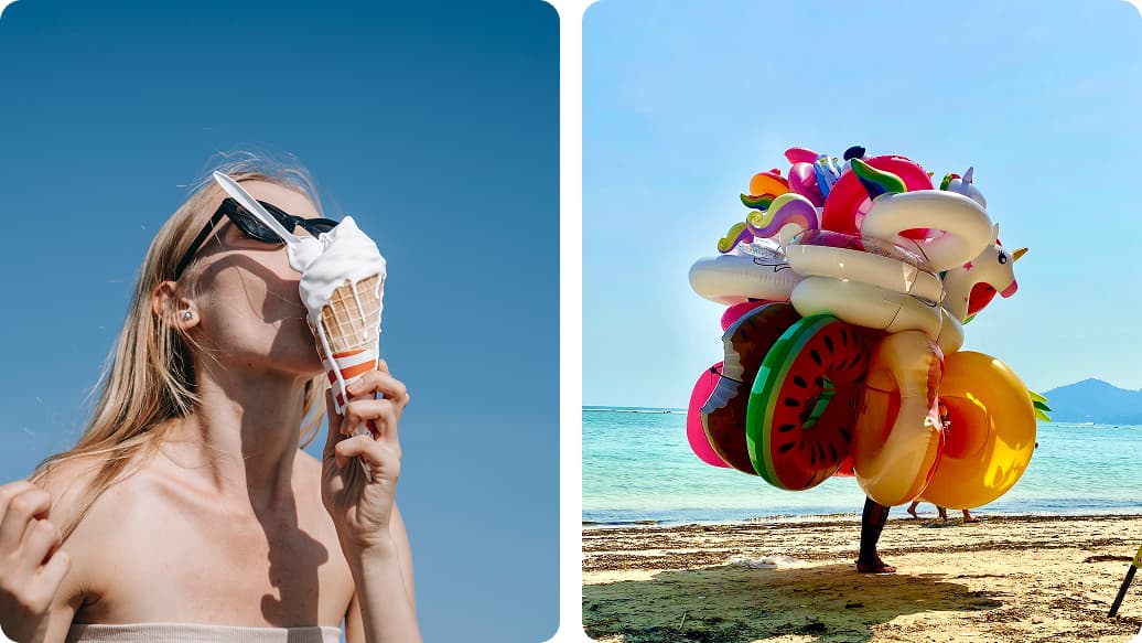 Bright, joyful photos of young people traveling. These often include fun, lighthearted scenarios—like holidays, juggling ice creams, or holding balloons.