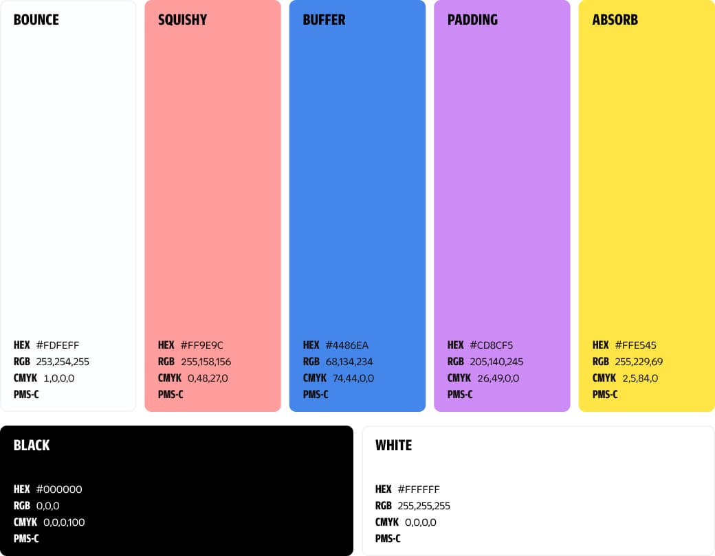 To reflect the visual language of “shock absorption,” the layout uses rounded containers and soft, squishy divisions to structure content. This section explains how these modules are applied to organize the brand’s system.