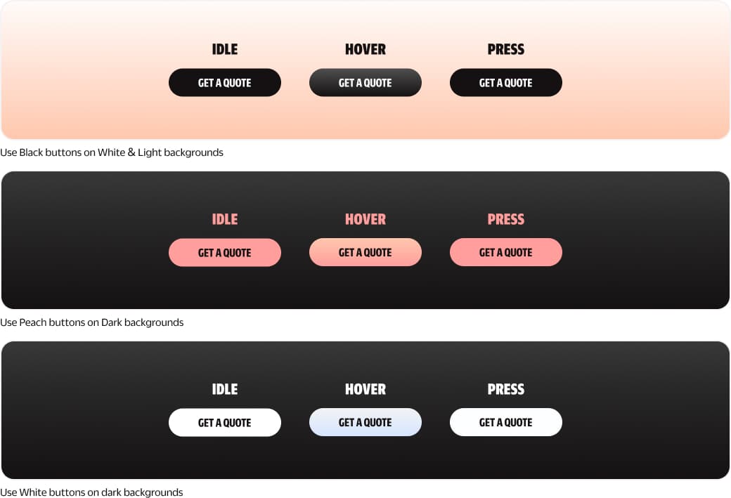 Primary buttons use the core brand colours to ensure legibility across all background types. Usage should follow specific colour compliance guidelines.