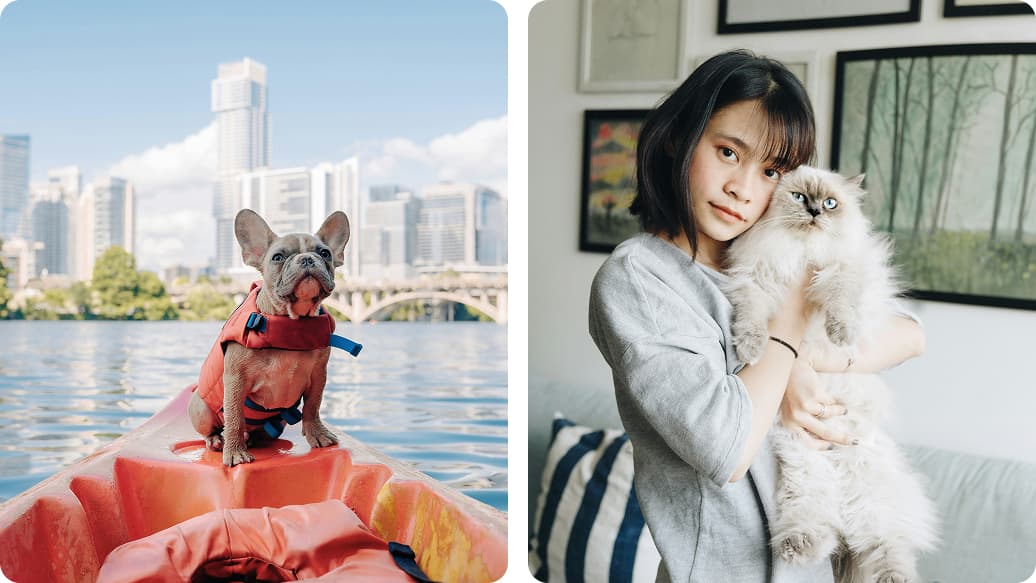 Focus is placed on pets and their emotional connection with their owners. The imagery should feel cute, silly, cuddly, and emotionally engaging—aiming to capture heartwarming, spontaneous moments.